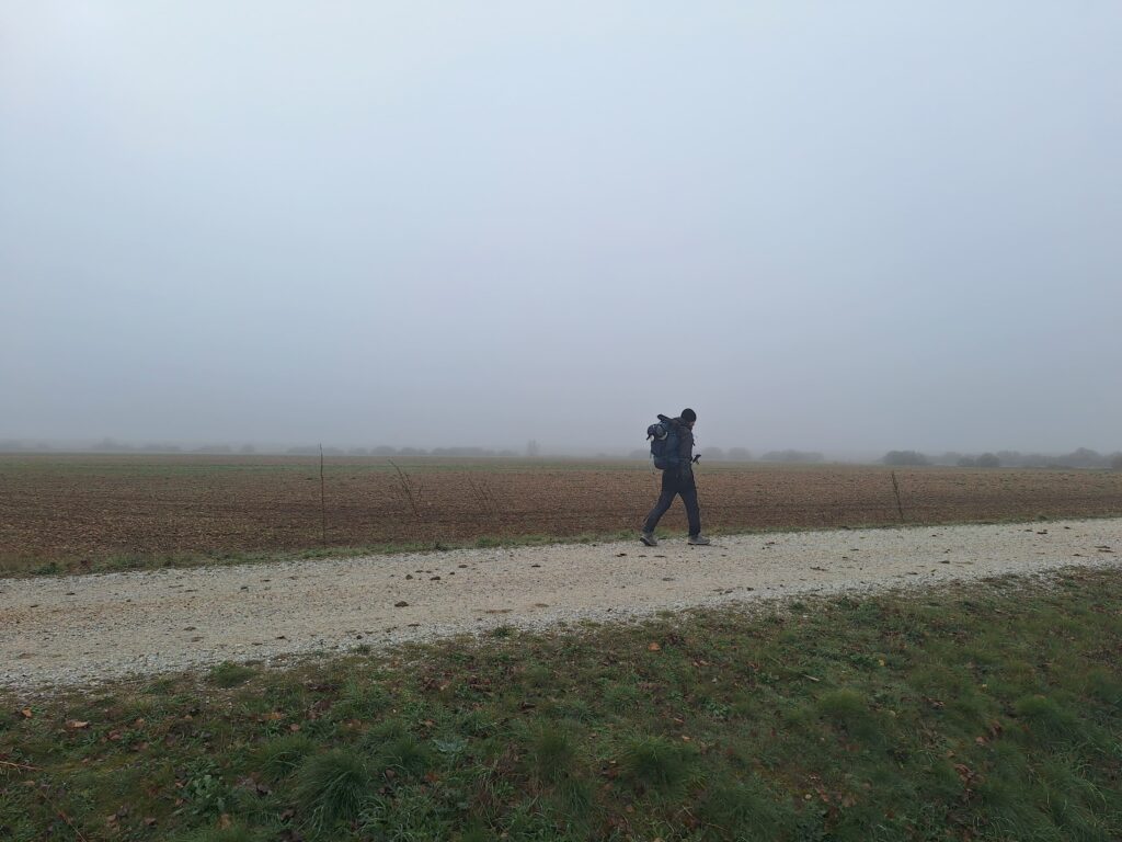 Le matin, on apprécie de quitter un lieu. On progresse le temps nécessaire, sur un chemin qui nous est inconnu, confiant des rencontres; enhardi par la destination choisie. Chaque foulée de notre corps devient un consentement à l’action; un abandon, sans attente en dehors de l’intuition d’être sur la bonne voie. Malgré les difficultés, sur cette terre et sous ce ciel, on s’accorde une légitimité à être pèlerin. Elle nous permet de sentir la Vie nous transmettre sa présence divine. Le chemin par défaut se transforme en nouvelles espérances à vivre.